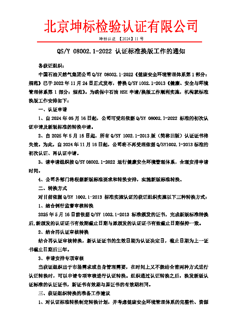 QS/Y 08002. 1-2022認(rèn)證標(biāo)準(zhǔn)換版工作的通知 坤標(biāo)認(rèn)證[2024] 11號